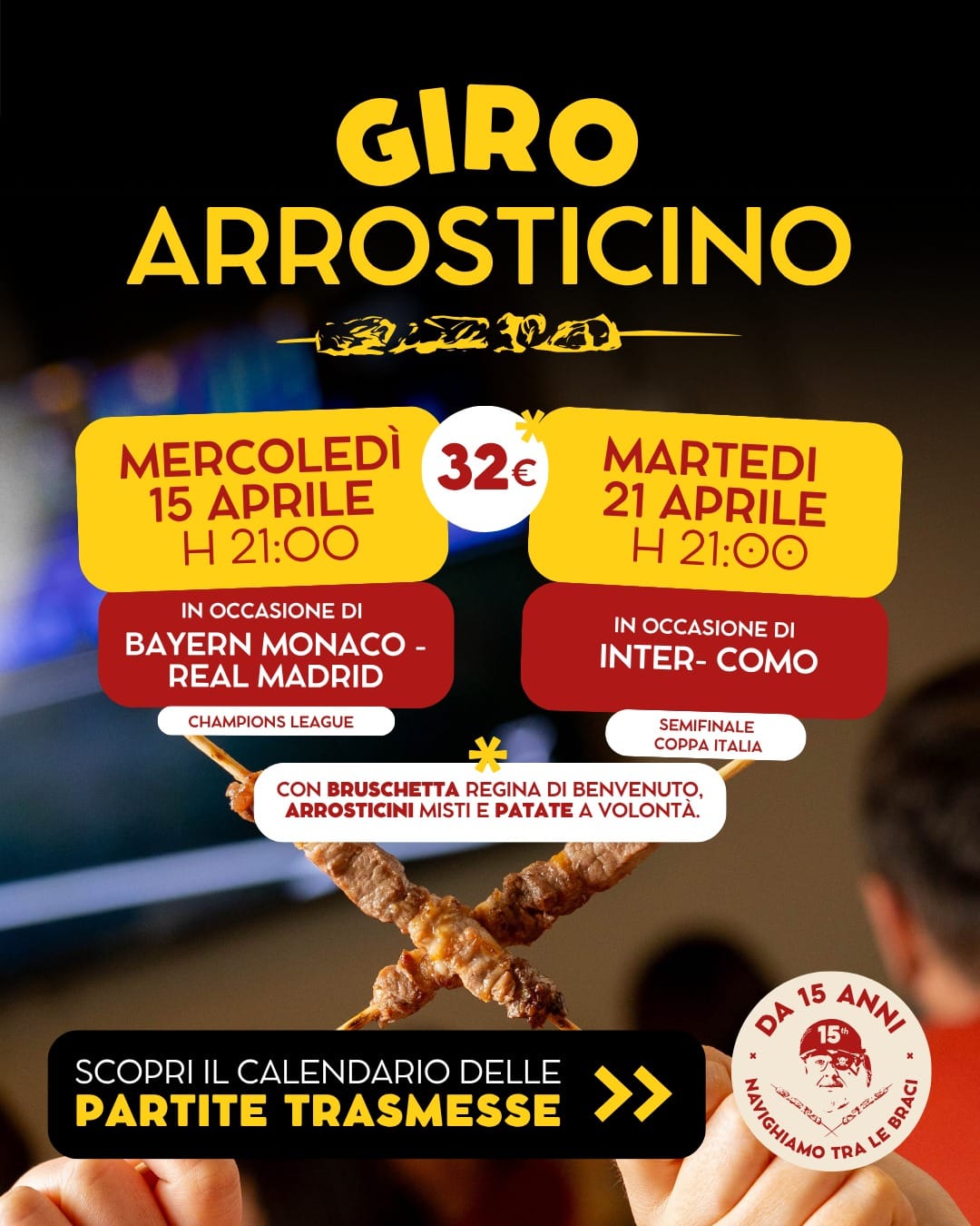 Ogni mese troverai qui e sui nostri social le partite nelle quali è attivabile la formula menu all you can eat “Giro Arrosticino”.