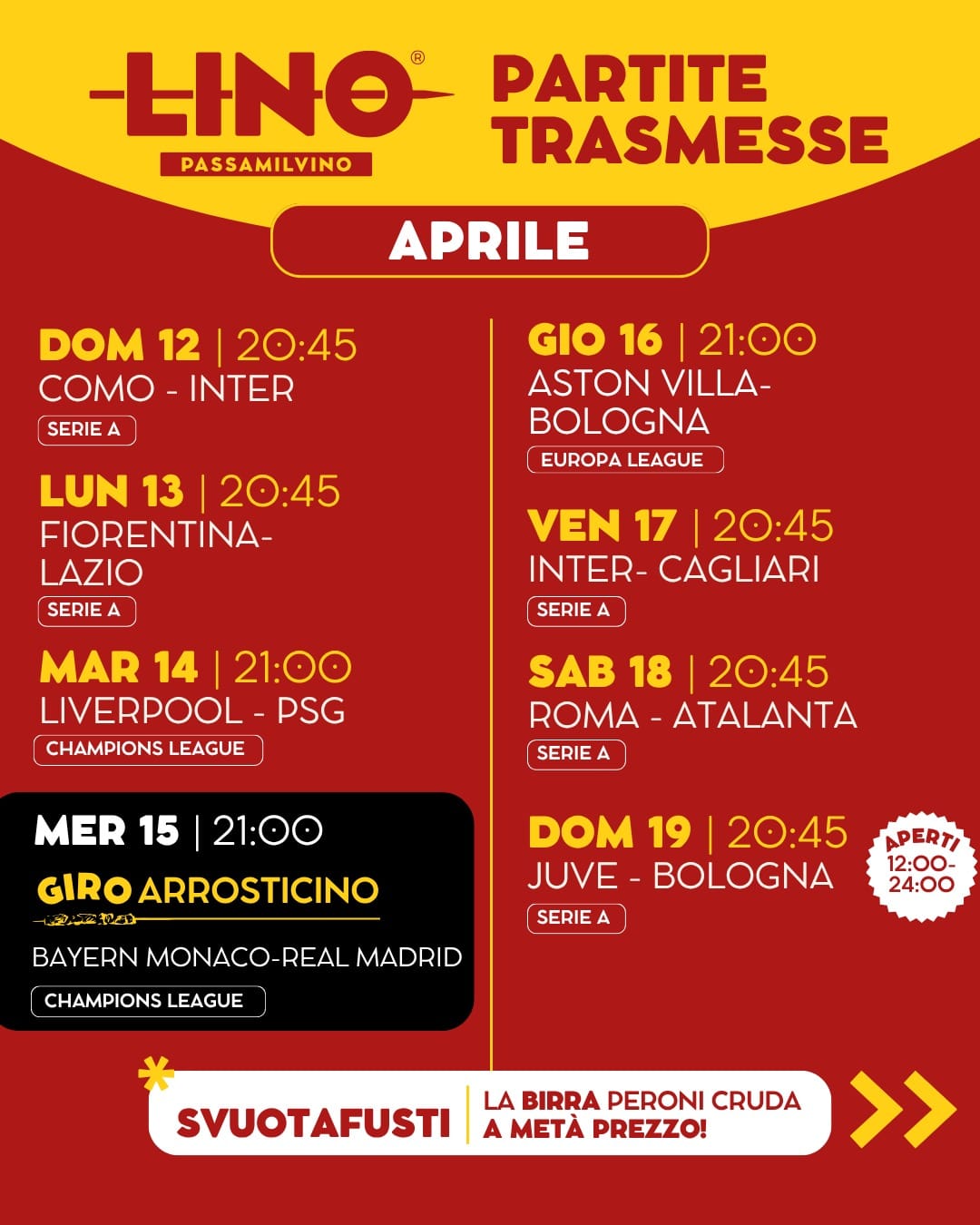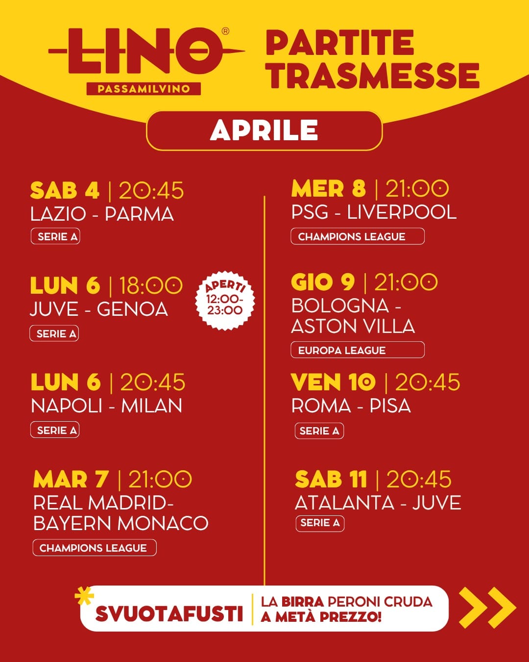 calendario delle partite da vedere al locale da Lino a Torino ad Aprile 2026.
